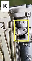 ribber. The adjustment is made by lifting or lowering this adjuster. I recommend that you use the two aluminium claw weight hangers (see picture ‘J’) as a feeler gauge. Place these two together to be able to use the thickness of these to get the distance between the two beds correct. Now place them over the top of the ribber gate pegs, pull forward 5 or 6 needles on the machine so that the claw weight hangers are sandwiched see picture ‘M’ you will need to move the ribber adjuster up and down so that the needles are just touching the hangers, get down to eye level, make sure that the needles do not rise. Obviously if your sponge bar is no good all of this will be a waste of time.